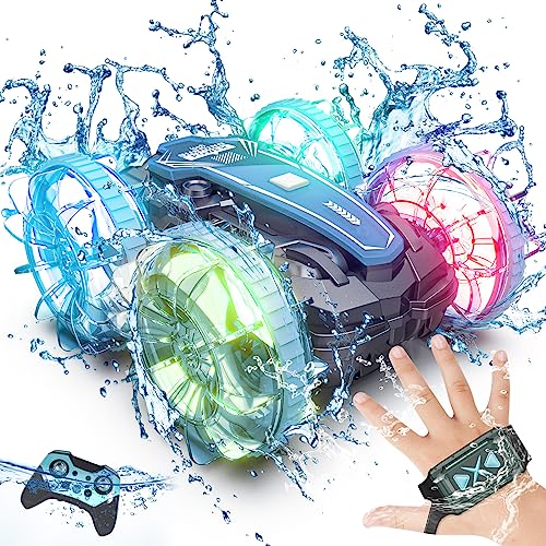 Tecnock Amphibisches Ferngesteuertes Auto, 4WD 360° Drehbares Gestensensor Stunt RC Auto mit Lichtern, Ferngesteuertes Boot mit Wasserdichter Fernbedienung, Geschenke Spielzeug ab 3 4 5 6 7 8+ Jahre