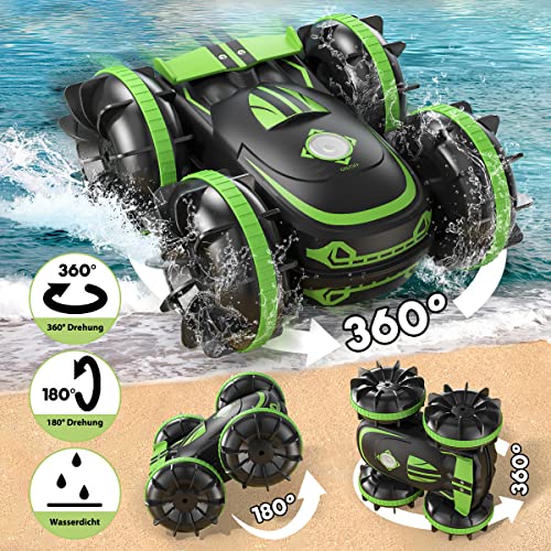 Amphibisches Offroad-RC-Auto: Sie können es an Land, am Strand, auf Gras, in den Bergen und im Schwimmbad steuern. Mit Allradantrieb kann das RC-Car schnell um 180° kippen oder um 360° drehen, wenn es auf ein Hindernis trifft, und dann vorwärts fahren. Bitte lesen Sie die Bedienungsanleitung vor Gebrauch sorgfältig durch.