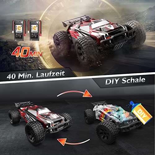 2 wiederaufladbare Batterien:Das Auto ist mit zwei hochwertigen, sehr langlebigen 7.4V/1700mAh Batterie ausgestattet,die Batterie sind besser als andere normale Batterien. Laufzeit beträgt bis zu 40 Minuten (20 Min für Jede Batterie) . Doppelter Spaß am Spiel.