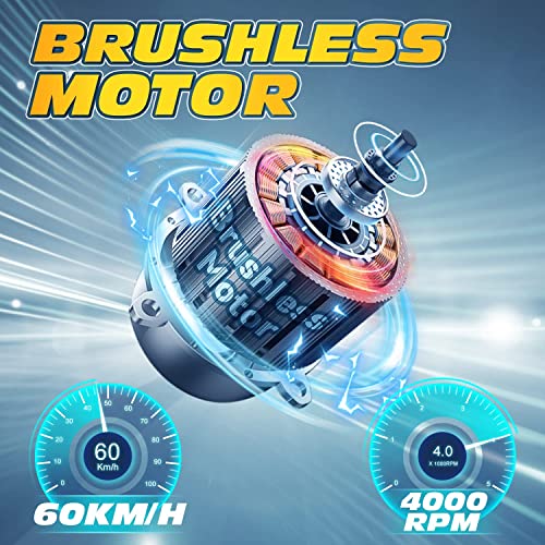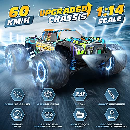 【1:14 Bürstenloses RC Auto】 Der 2440 bürstenlose Motor liefert unglaubliche Leistung und erreicht Geschwindigkeiten bis zu 60km/h! Mit 25A brushless ESC, 1.5kg Drehmoment Lenkservo, LED Beleuchtungssystem und hochfestem Fahrwerk, liefert dieses RC Car Monsterleistung. Drücken Sie den Abzug, und der 001E fliegt über Sprünge und sorgt in jeder Kurve für Nervenkitzel.