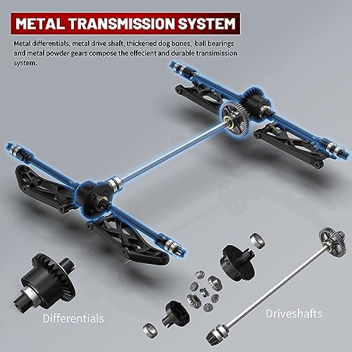 Umfassendes Upgrade: Vordere und hintere Metalldifferentiale, Metallübertragungswellen, fettgedruckte Hundeknochen und Kugellager bilden das Kraftübertragungssystem, Wabenstruktur-Chassis aus neuen Materialien, verbreiterte Reifen und metallverstärkte Teile, das verbesserte RC-Auto zeichnet sich durch seine Haltbarkeit und Leistung aus.