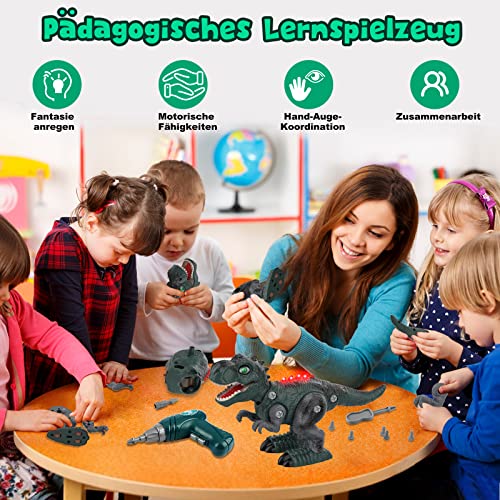 【Sicher und Einfach Zusammenzubauen】 Unser zerlegbares Dinosaurierspielzeug enthält 1 elektrische Bohrmaschine, 2 Handschraubendreher und eine Anleitung. Kinder können leicht verstehen, wie man es zusammenbaut. Die elektrische Bohrmaschine hat eine niedrige Geschwindigkeit, die gedreht werden kann, um Schrauben anzuziehen und zu lösen, und schadet den Kindern nicht.