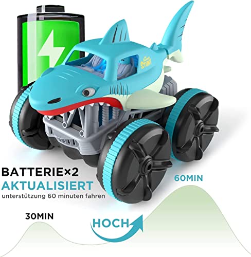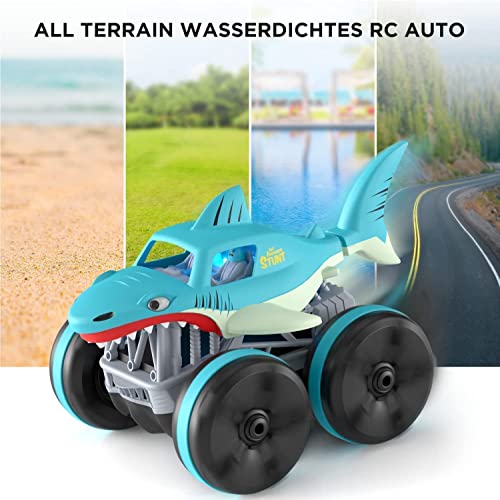 ????【Hai Amphibisches Ferngesteuertes Auto】: Mit Simulierte Haiform und Coole Akrobatik, dieses ferngesteuerte Auto definitiv ein attraktiver Spieler im Wasserfahren! Der Haifischschwanz kann sogar mit der Lenkung des Autos schwingen und kann sogar als RC-Boot verwendet werden, um sich um 360°zu drehen und Donutbewegungen auf dem Wasser auszuführen. Dieses neu gestaltete Auto ist für alle Terrains geeignet:Gras, Sand, Felsen, Pool.