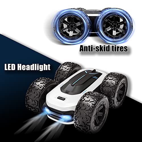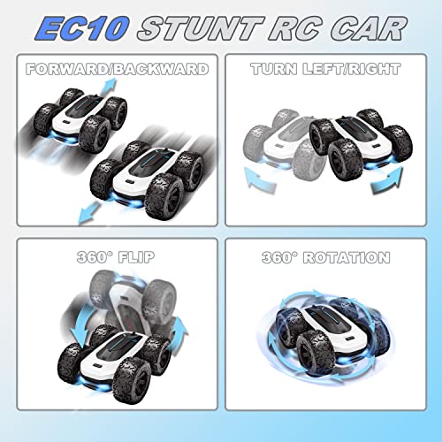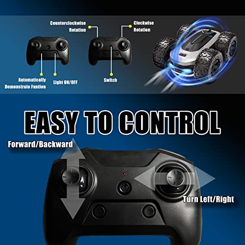 【Funktion】 Das ferngesteuerte Stunt auto ist mit Allradantrieb ausgestattet und die Höchstgeschwindigkeit kann 15 km / h erreichen. Es kann sich um 360° im Uhrzeigersinn oder gegen den Uhrzeigersinn drehen und kann auf beiden Seiten fahren. Eine Taste kann die automatische Demonstrationsfunktion mit coolen LED-Lichtern (ein- und ausschaltbar) einschalten, die Kindern mehr Spaß machen.