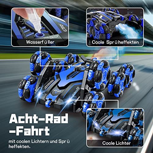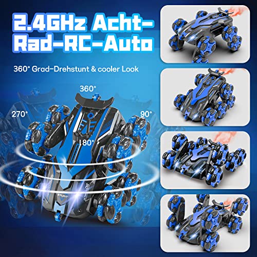 【Ferngesteuertes Auto ab 4 5 6 8 10 Jahre】Ein supercooles ferngesteuertes achträdriges auto mit Lichtern und realistischem Spray. Das Ferngesteuerte Auto hat ein Design mit acht Rädern. Kinder können das RC auto steuern, um sich vorwärts, rückwärts, rechts und links zu drehe. Auch können sie die Reifen so steuern, dass das Auto sich um 360 Grad dreht, um eine Vielzahl von coolen Spielformen zu ermöglichen. Eine Kombination aus mehreren Features bietet endlose Möglichkeiten für coole Stunts, wilde Flips und tolle Tricks.