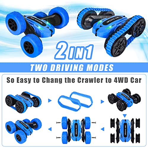 【2 in 1 Fancy Stunt Car】 Sie können das Fahrzeug zwischen Raupen und 4WD-Auto wechseln. Elastischer Anti-Rutsch-Hohlreifen, 360°-Flip realisierbar, doppelseitiger Lauf, geeignet für Wettkämpfe auf vielen Bodenarten wie Land, Strand, Gras, Pflaster, Schneeland oder Feuchtgebiet.