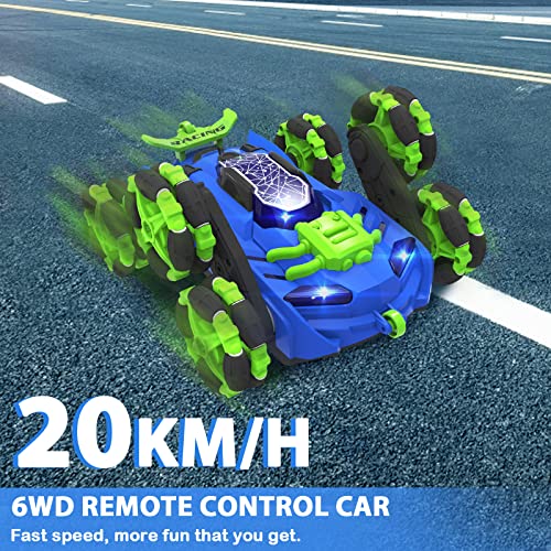 【All Terrains RC Stunt Auto】Dieses 6WD RC Auto hat coole Farbe und Aussehen. Es kann Hindernisse überwinden, indem es die Höhe der Räder verändert. Das rc car kann sich um 360° drehen. Es kann drift wie ein echtes Auto. Es ist für die meisten Terrains wie Rasen, Kies und Sand geeignet. Es ist ein interessantes Spielzeug für Kinder, das drinnen und draußen verwendet werden kann.