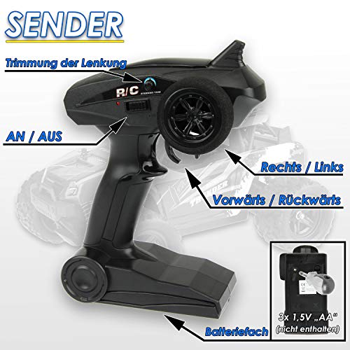 ABMESSUNGEN VOM BUGGY Der ferngesteuerte Buggy im Maßstab 1:18 ist ca. 29 cm lang und wiegt ca. 800 Gramm. Das RC Car ist für Kinder ab 14 Jahren geeignet.