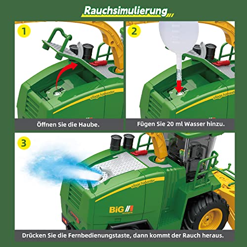 【Der nachgebildete Mähdrescher Ferngesteuert】Der Arbeitsmodus und der Fahrmodus des traktor spielzeug können frei umgeschaltet werden. Der Fronthäcksler kann während der Fahrt geschlossen und angehoben werden. Der Mähdrescher kann während der Arbeit ausgeklappt werden und der Drehteller kann gedreht werden, um die echte Ernte zu simulieren. Es kann auch mit Wasser gefüllt und mit einem Knopf gesteuert werden.Der Rauchschalter macht die Arbeit des Mähdreschers realistischer, und eine Vielzahl von Gameplays sind frei steuerbar, sodass die Enthusiasten des Bauernautos mehr Spaß haben.