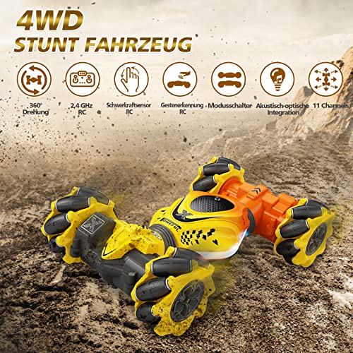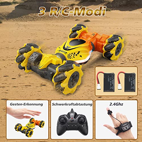 Upgraded 3 Kontrolle 2 Akuus Ferngesteuerte Autos: Die Ferngesteuertes Auto mit fernbedienung hat drei Arten von Fernbedienung, Gestensteuerung Fernbedienung Sensing, Handgelenk Sensing und 2.4Gh Fernbedienung erreicht empfindliche und präzise Fernbedienung. Einzigartige Ferngesteuerte Auto mit HandSteuerung, schalten Sie den Off-Road-Modus mit Ihrer Hand Fernsteuerung Auto. 360° Allround-Fahren gelber Powerextra RC Stunt Auto ausgestattet mit zwei Lithium-Batterien für extra viel Spaß.