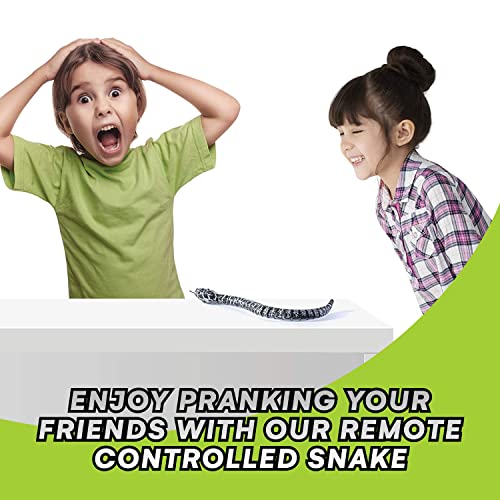 REALISTISCHE EIGENSCHAFTEN UND DESIGN: Das authentische Spielzeug! Genießen Sie es, Streiche zu spielen und Ihre Freunde mit dieser lustigen RC-Schlange abzuschrecken. Die Klapperschlange wackelt, wenn sie sich schnell bewegt. Vorwärts-, Links- und Rechtsdrehung (hat auch eine Stopptaste) mit einziehbarer Zunge und schwingendem Schwanz.