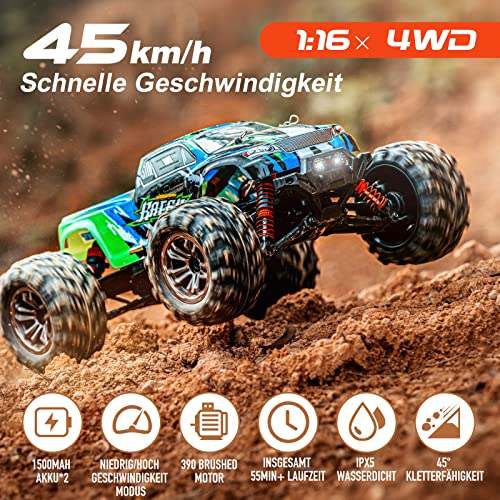 【1:16 Skala Hobby Grade RC Auto】This rc Auto für Erwachsene mit All-Terrain-Reifen und aktualisiert leistungsstarken Motor ausgestattet, erreichen bis zu 45+ Km/h hohe Geschwindigkeit, die die rc Buggy, um eine schnelle Geschwindigkeit haben kann, kann eine größere Wettbewerbsfähigkeit in Drag Race bringen.Dieses Hobby Monster Truck rc Auto hat eine 45-Grad-Steigung, um ungehinderten Verkehr auf verschiedenen Terrains zu gewährleisten.